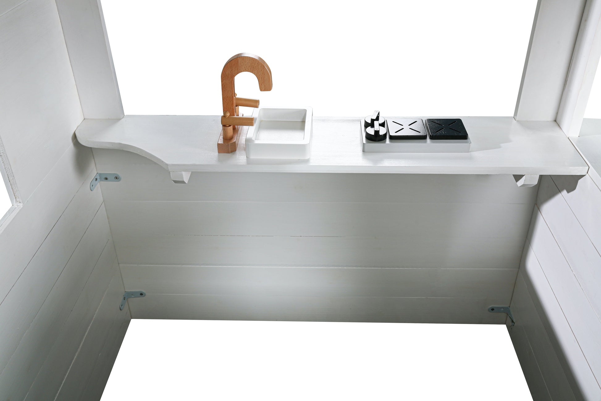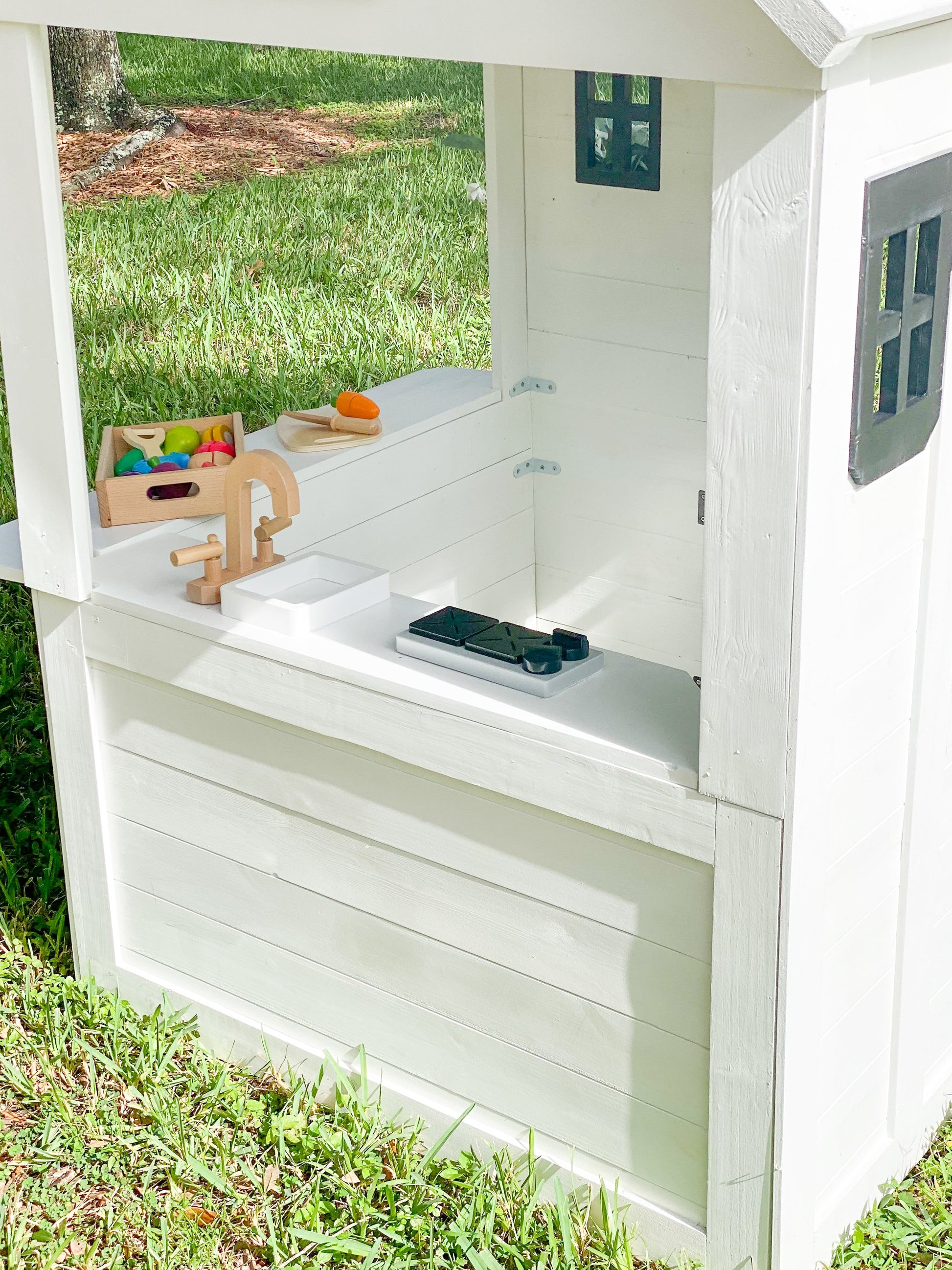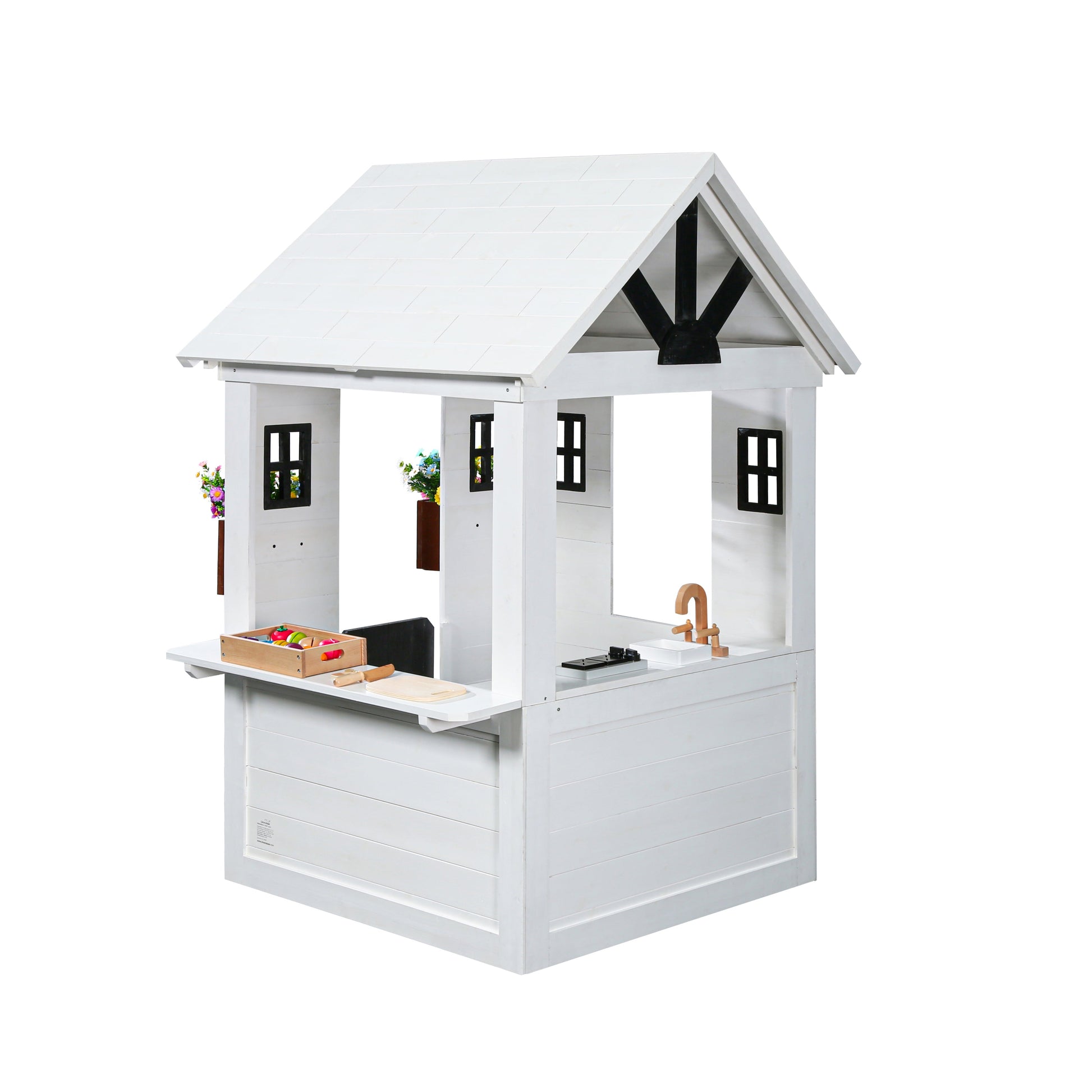 The playhouse includes a built-in kitchen, beautiful wooden play food, and cedar window boxes to create your own potted garden. These features provide hours of sensory play and help kids to explore their imaginations.