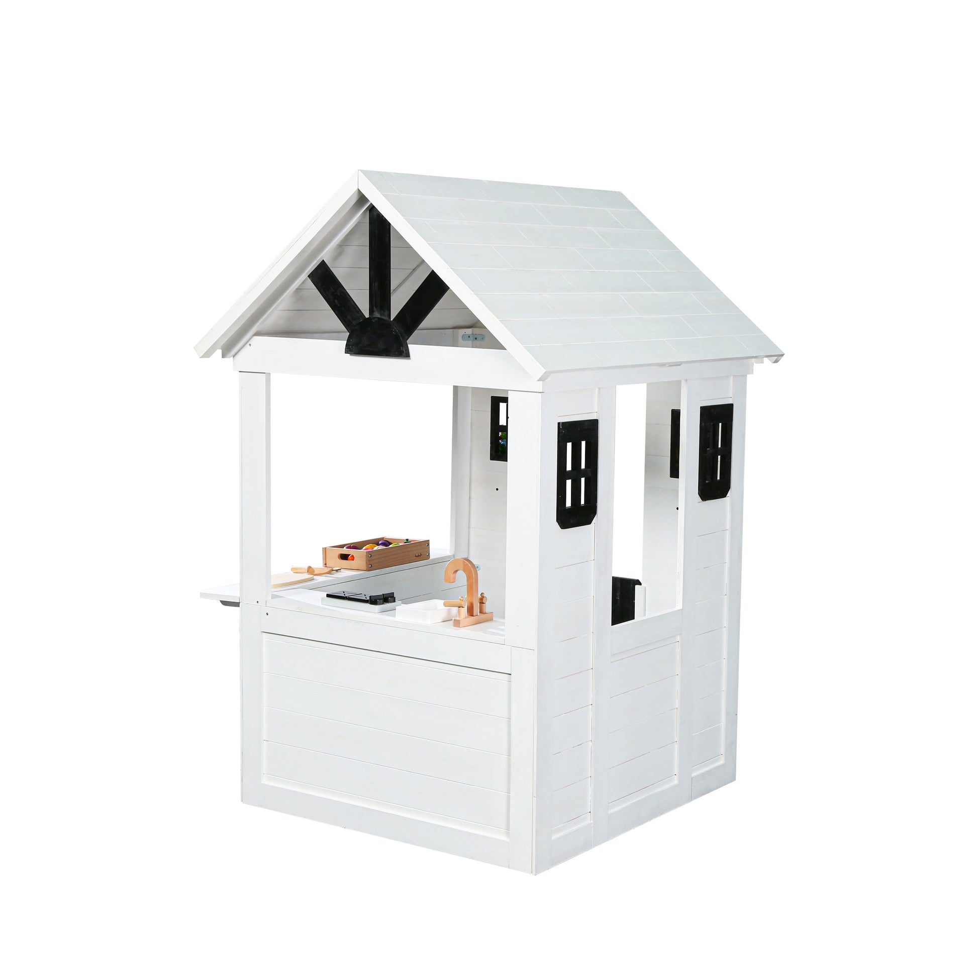 The Ajure Playhouse is a fun and imaginative playhouse for kids. It features a beautiful white and black farmhouse design that will create a stunning addition to any backyard.